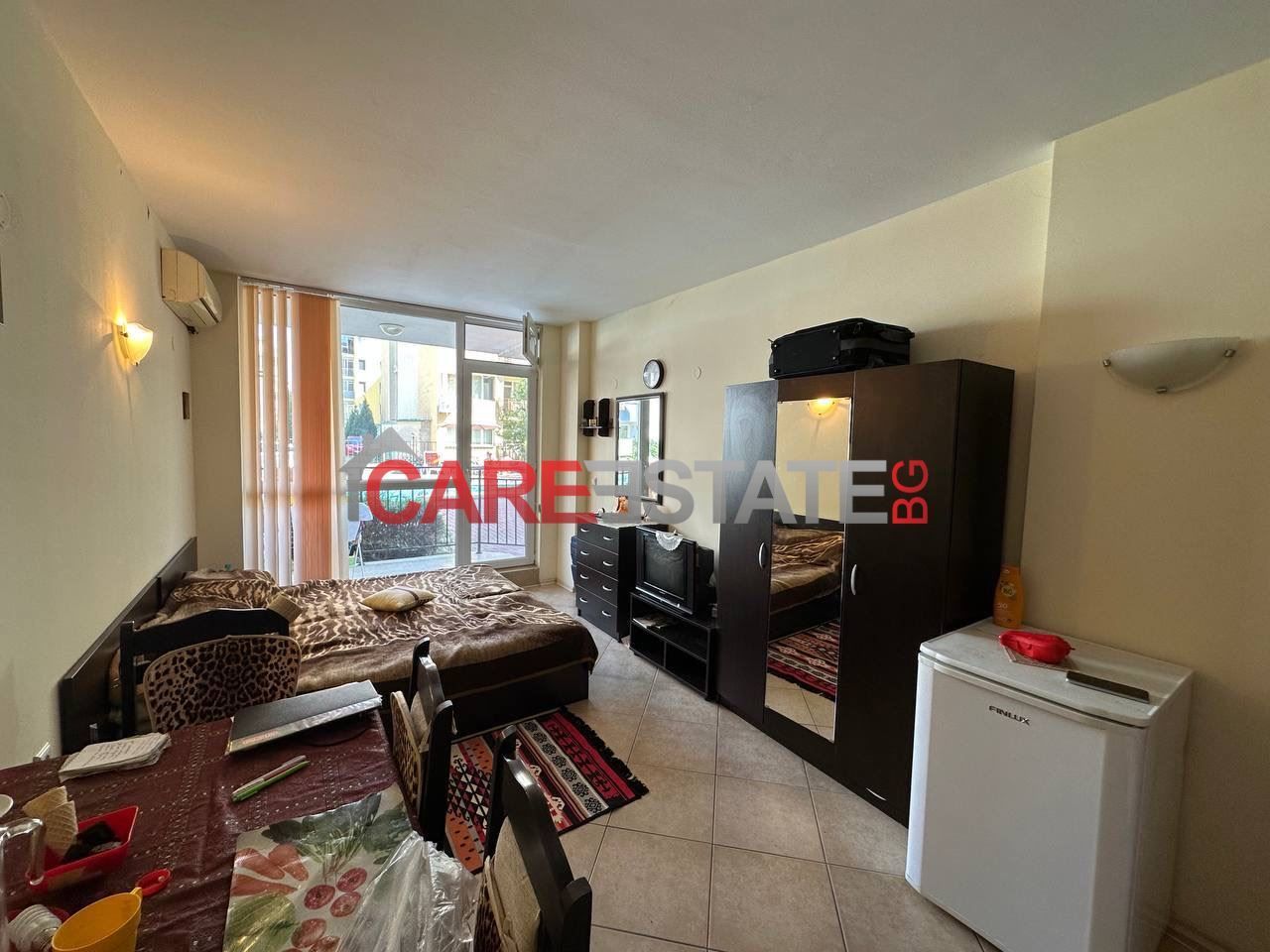 - 🛋️ Разпределение: отворено пространство с дневна, кухненски бокс и зона за сън; излаз към балкон; баня с тоалетна