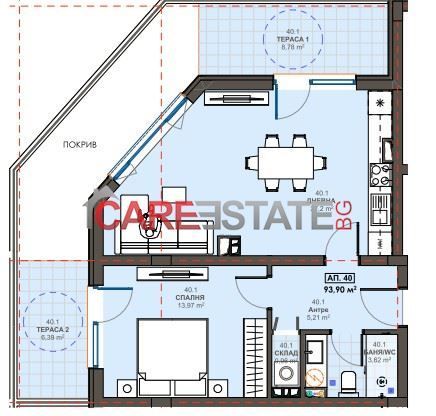 Апартаментът е с обща площ от 94 кв.м и функционално разпределение: просторна дневна с кухненска зона, светла спалня, баня с тоалетна и склад към имота, осигуряващ допълнително удобство и практичност. Жилището разполага с изключително голяма и просторна тераса, обхващаща всички помещения. Значителна част от терасата не влиза в обявената квадратура на апартамента, което предоставя допълнително пространство за обособяване на кът за отдих, лятна градина или зона за релакс 🌿